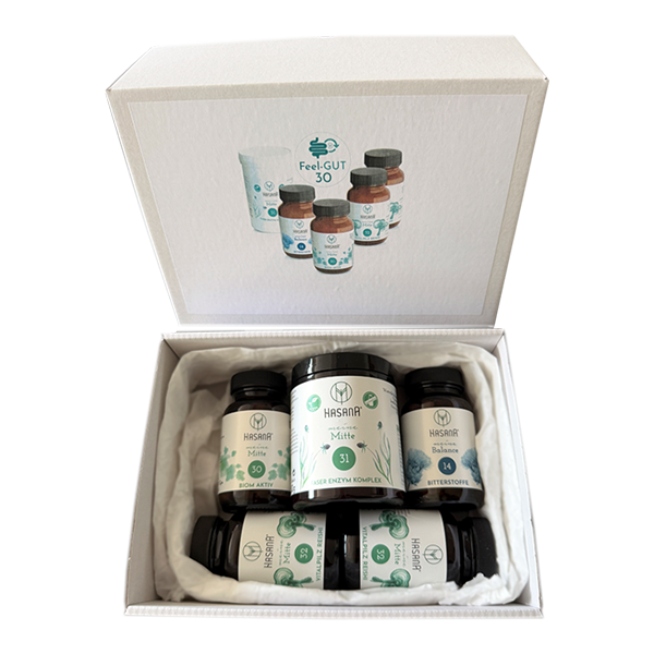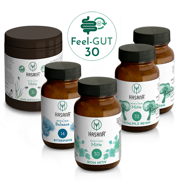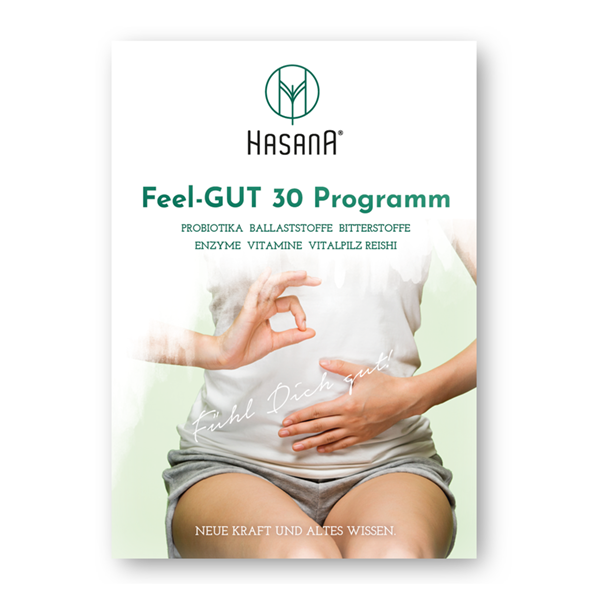 Das HASANA® Feel-GUT 30 Programm ist ein 30-Tage-Begleiter für mehr Wohlbefinden, Achtsamkeit, Unterstützung für die Ernährung und die Darmschleimhaut|1